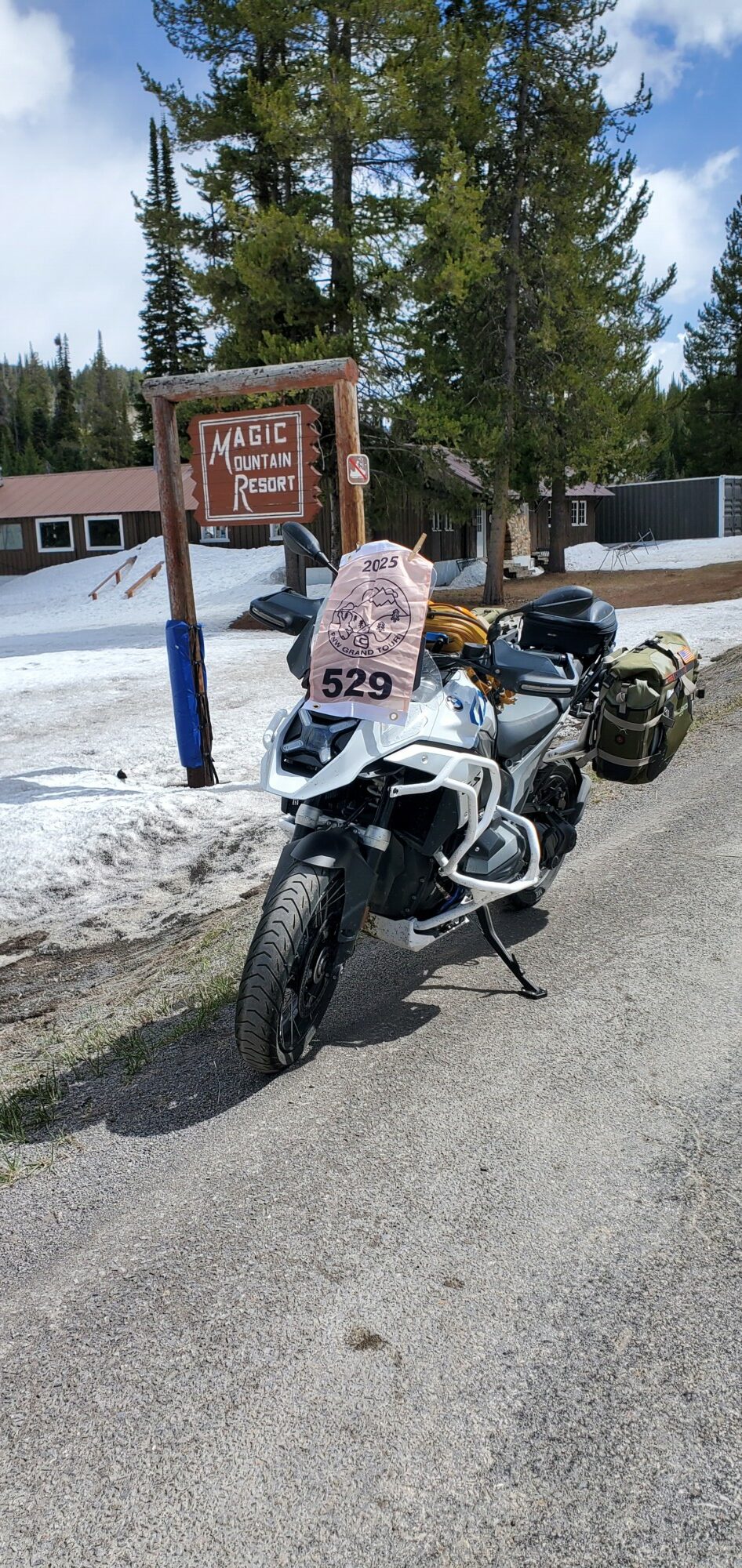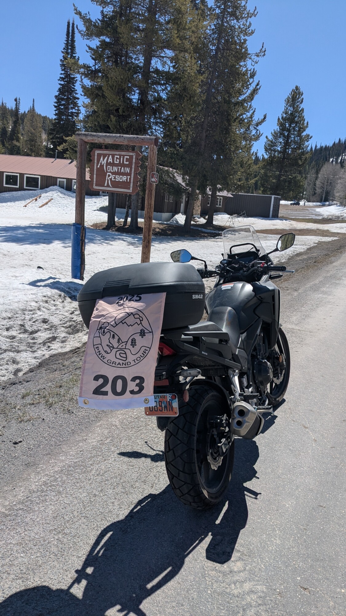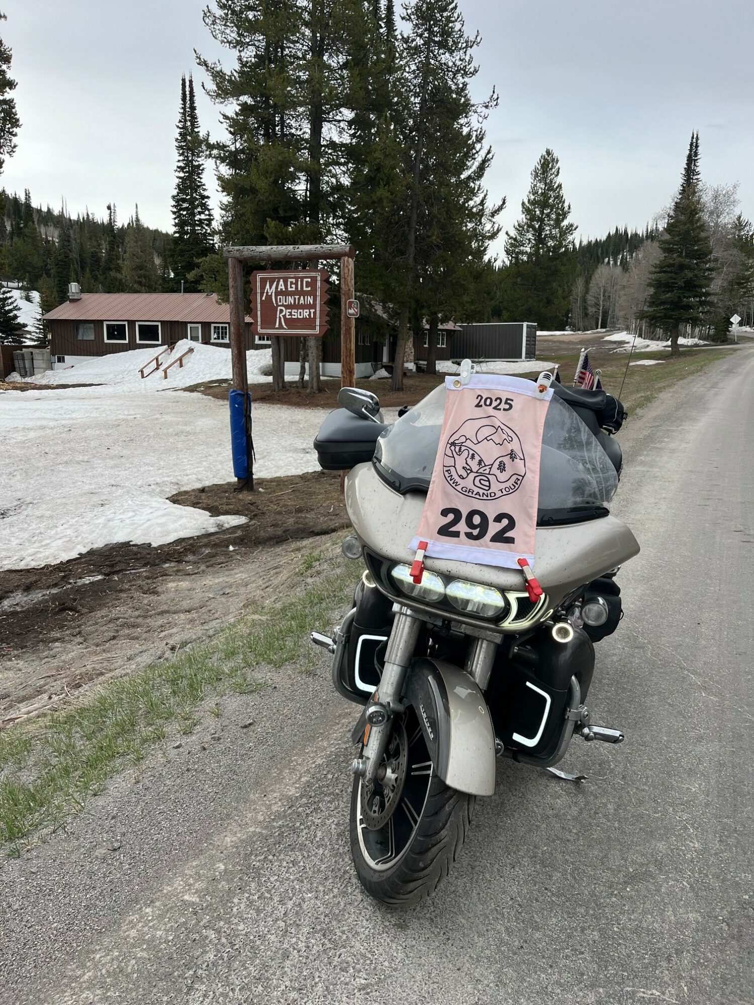 Take a picture of the Magic Mountain Resort sign with your bike and flag in the picture.